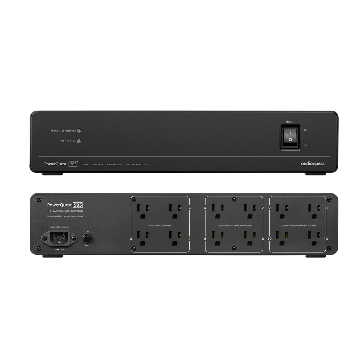 AudioQuest PowerQuest 505 is a high-performance power conditioner with 12 AC outlets (4 High-Current outlets for amplifiers and 8 Ultra-Linear-Filtered outlets for source components), a 2m detachable AC power cable featuring ZERO-Tech and RF/ND-Tech, and 2RU rack ears for simple rack-mounting.