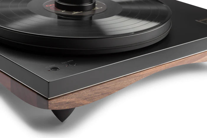 With black lacquered MDF upper plinth, black anodized aluminium metal parts and black platter