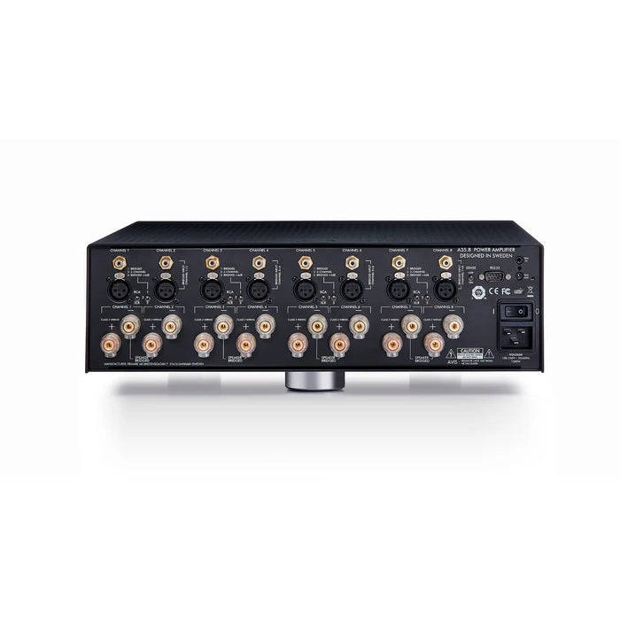 Each pair of output channels can be bridged, allowing the amp to provide power to virtually any multi-channel speaker configuration, either on its own or with an A35.2 stereo amplifier.